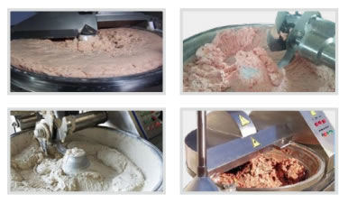 1. The chopping and mixing machine uses the high-speed rotation of the chopper to finely chop the meat chunks, minced meat, fat and other main raw materials into meat stuffing or minced meat, while mixing other raw materials such as water and ice and auxiliary materials into uniform paste. The high speed rotation of the chopper can shorten the operation time, reduce the heat generated by the materials, and maintain the natural color, elasticity, yield and product shelf life of the stuffing. In addition, the equipment is also suitable for crushing fishes, fruits and vegetables.